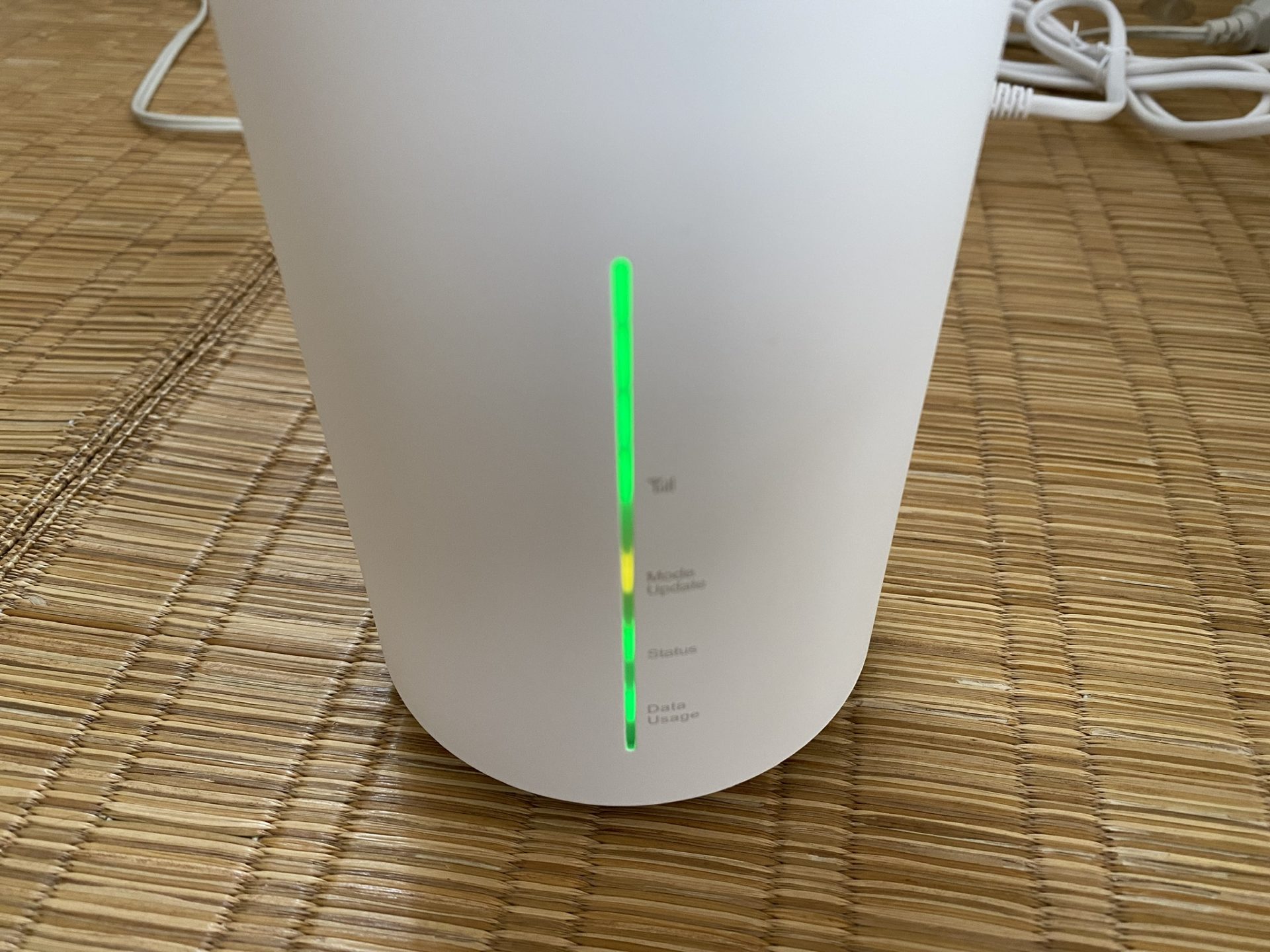 すべてのLEDが点灯してます。上から電波状態アンテナ4本、二段目の黄色はLTE(ハイスピード+)状態です。